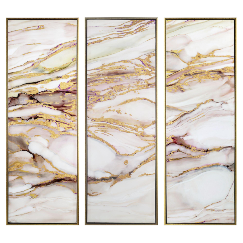 Триптих из картин с абстрактным сюжетом в пластиковой раме. Картина выполнена путем печати на холсте и нанесением золотистой фольги. Поверхность холста залита акрилом, для придания сходства с полированным срезом камня. Подрамник выполнен из массива дерева. Размеры указаны для одной из трех картин. Картина модульная и состоит из 3-х частей. Поставляется комплектом из 3-х шт. Размеры: 92x5х32 см.