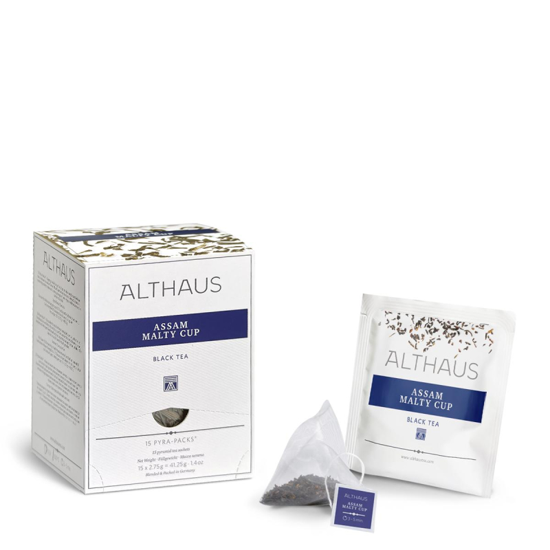 Чай Althaus Pyra Pack Assam Malty Cup черный байховый 15 пакетиков - это ароматный и насыщенный чай с благородных индийских плантаций провинции Ассам. Каждый ценитель чая знает, что именно там произрастает один из известнейших сортов, который впитывает в себя всю природную щедрость живописной долины Брахмапутры. Настой Althaus Assam Malty Cup обладает высокой крепостью, что делает его прекрасным бодрящим напитком и незаменимым вариантом для яркого утреннего пробуждения. Также он станет идеальным сопровождением деловых встреч и серьезных разговоров. В тяжелые, трудовые будни он поможет сконцентрироваться на ответственных задачах, восполнить энергию и зарядиться силами на новые победы. Для приготовления чашки бодрящего напитка заварите чайный пакетик кипяченой водой и настаивайте 4-5 минут. Подавать его можно как в самостоятельном виде, так и дополнив печеньем или закусками, что позволит утолить голод и жажду. В упаковке содержится 15 пирамидок чая. Каждая пирамидка надежно упакована в четырехслойный конверт, который состоит из белой бумаги с названием и фирменным логотипом, полиэтилена пониженной плотности, алюминиевой фольги и полипропилена, что исключает потерю первоначального вкуса и аромата чая в процессе транспортировки и хранения. Приятного чаепития! Состав: чай черный байховый индийский. Способ приготовления: заварить чайную пирамидку в чашке или заварочном чайнике горячей водой и настоять 4-5 минут. Вес: 41,25 г. Количество пакетиков в упаковке: 15 штук. Тип упаковки: картонная коробка. Условия хранения: хранить в чистом, хорошо вентилируемом помещении без посторонних запахов с относительной влажностью воздуха не выше 70%. Страна производства: Германия.