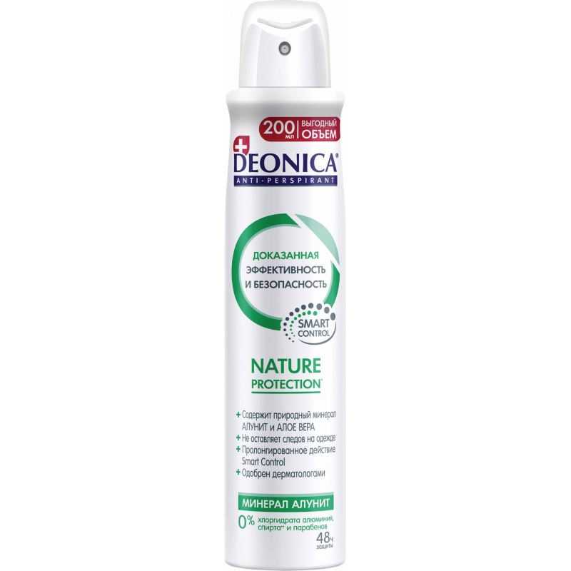 Уникальный антиперспирант Deonica "Nature Protection" создан на основе суперчистого минерала Алунит фармацевтического качества. Обеспечивает защиту от пота и запаха на 48 часов, не блокируя работу потовых желез. - Натуральная защита от пота и запаха в течение 48 часов. - Не вызывает раздражения. - Одобрен дерматологами. - 0% спирта и парабенов. - Содержит минерал Алунит фармацевтического качества, который обладает антибактериальным, противовоспалительным и противомикробным действием. - Содержит экстракт Алоэ-Вера, который оказывает антибактериальное и противовоспалительное воздействие, тонизирует и увлажняет кожу. - Имеет легкий свежий аромат. - Не оставляет следов на одежде. Deonica - антиперспирант, который гарантированно подарит Вам защиту и ощущение свежести в течение дня! Рецептуры всех антиперспирантов Deonica разработаны в Швейцарии и сочетают в себе натуральные и безопасные активные компоненты, а также высокоэффективную защиту. Одобренная дерматологами формула подходит для людей с чувствительной кожей. Натуральные активные компоненты в составе антиперспиранта гарантировано защитят от неприятного запаха, а особая формула не оставит белых следов на одежде. Высокая эффективность Deonica подтверждена клиническими испытаниями и потребительскими тестами в европейских лабораториях. Сбалансированная линейка средств рассчитана на физиологические особенности активности женщин и мужчин, на активность в течение дня и особенности кожи. С инновационным антиперспирантом нового поколения Deonica Вы сможете чувствовать себя уверенно при любых обстоятельствах. Применение: нанести на чистую сухую область подмышек. Дать полностью высохнуть во избежание образования пятен на одежде. Не наносить на поврежденную или раздраженную кожу. Состав: Isobutane, Aqua, Cyclopentasiloxane, PEG/PPG-18/18 Dimethicone, Butane, Propane, Potassium alum, Triethyl Citrate, Aloe Barbadensis, Parfum. Объем: 200 мл.
