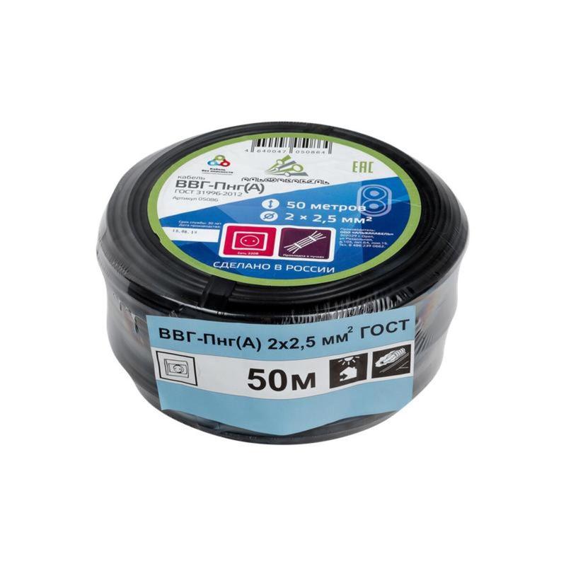 Кабель ВВГ-Пнг (А) 2x2.5 0,66 кВ (50метров) бухта черный Альфакабель 65529 ГОСТ состоит из двух гибких медных жил, которые изолированы в оболочку из поливинилхлоридного пластиката. Этот материал не позволяет распространиться возгоранию на прилегающую группу проводов. Он предназначен для прокладки групповых сетей на эстакадах помещений закрытого типа. Особенности: - Длина составляет - 50 метров; - Сечение жил составляет 2,5 кв.мм ; - Следует использовать в диапазоне температур от -50 до +50 градусов; - Влажность воздуха не должна превышать 98%; - Монтаж кабеля можно осуществлять при температуре не ниже -15 градусов. Если температура ниже, то следует предварительно разогреть кабель; - Соответствует ГОСТ 31996-2012; - Номинальное напряжение - 660 В.