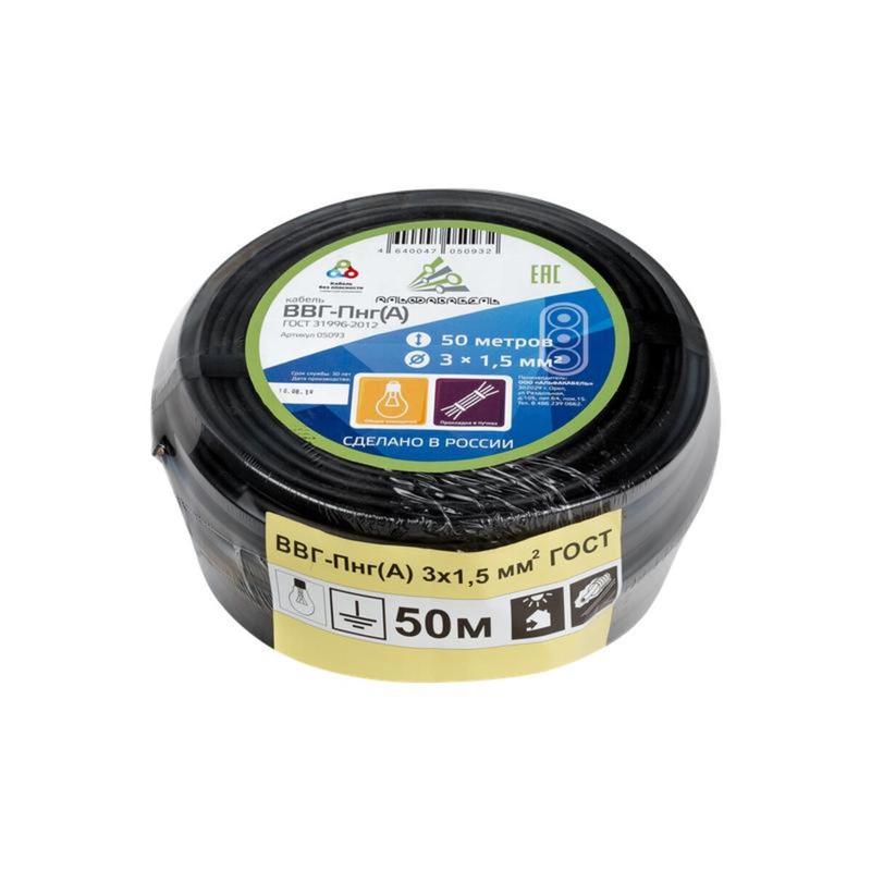Кабель ВВГ-Пнг (А) 3x1.5 0,66 кВ (50метров) бухта черный Альфакабель 465528 ГОСТ предназначен для прокладки групповых сетей в помещениях закрытого типа. Оболочка изготовленная из поливинилхлоридного пластиката пониженной горючести, и не позволяет распространится горению на остальные кабеля. Также в случае замыкания и возгорания выделяется меньше дыма в соответствии с EN61034-2. Медная жила имеет первый класс гибкости и сечение в 1,5 кв.мм . Таких жил в кабеле три, одна из которых является нулевым проводом. Особенности: - Длина составляет - 50 метров; - Соответствует ГОСТ 31996-2012; - Рабочее напряжение до 660 В. - Температура при работе кабеля не должна превышать 350 градусов; - Эксплуатировать кабель в температурном диапазоне от -50 до +50 градусов; - С не разогретым кабелем можно проводить работы не ниже -15C; - Влажность воздуха должна быть не выше 98% процентов при температуре до +35C.