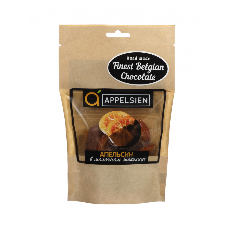 Карамелизованный апельсин в нежном молочном шоколаде. Масса нетто: 85 г. Состав: апельсины, сахар тростниковый, вода питьевая, какао тертое, сухое цельное молоко, масло какао, соевый лецитин, натуральная ваниль сорта "Бурбон". Пищевая ценность на 100 г продукта: белки - 2,9 г, жиры - 10,2 г, углеводы - 59,6 г. Энергетическая ценность на 100 г продукта: 315 ккал. Срок годности: 6 месяцев. Условия хранения: при температуре от 14 до 24 °С и относительной влажности воздуха не более 70%. Производитель: ООО "Апельсьен".