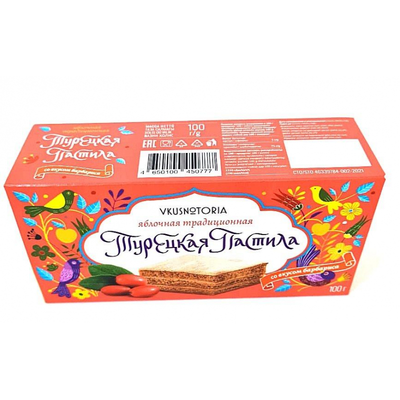 Пастила яблочная со вкусом барбариса. Состав: пюре яблочное, сахар, желирующий агент - пектин яблочный, белок яичный, ароматизатор. Пищевая ценность (содержание в 100 г продукта): белки - 1 г, углеводы - 71 г. Энергетическая ценность на 100 г продукта: 290 ккал. Условия хранения: хранить при температуре 18+3 °C и относительной влажности воздуха не более 75%, в чистых, сухих, хорошо вентилируемых складах, не зараженных вредителями, не подвергать воздействию прямого солнечного света. Вес: 100 г. Страна производства: Россия.