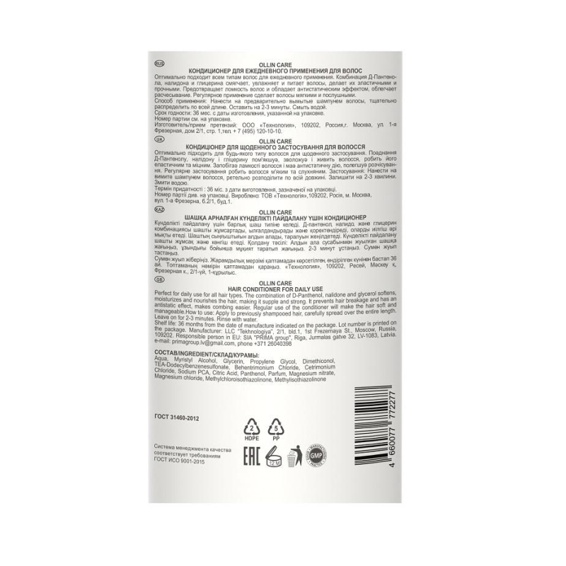 Оптимально подходит всем типам волос для ежедневного применения. Комбинация Д-Пантенола, налидона и глицерина смягчает, увлажняет и питает волосы, делает их эластичными и прочными. Предотвращает ломкость волос и обладает антистатическим эффектом, облегчает расчесывание. Регулярное применение сделает волосы мягкими и послушными. Состав: Aqua, Myristyl Alcohol, Glycerin, Propylene Glycol, Dimethiconol, TEA-Dodecylbenzenesulfonate, Behentrimonium Chloride, Cetrimonium Chloride, Sodium PCA, Citric Acid, Panthenol, Parfum, Magnesium nitrate, Magnesium chloride, Methylchloroisothiazolinone, Methylisothiazolinone. Способ применения: Нанести на предварительно вымытые шампунем волосы, тщательно распределить по всей длине. Оставить на 2-3 минуты. Смыть водой. Объем: 1000 мл.