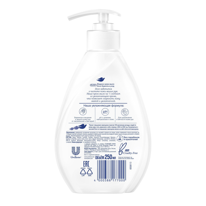 Крем-мыло Dove Красота и уход 250 мл. Назначение: На четверть состоит из увлажняющего крема, имеет нейтральный уровень pH, не содержит щелочи. Мыло обеспечивает оптимальное увлажнение и питание кожи, препятствует пересушиванию и разрушению эпидермиса. Поставляется в экономичных флаконах с дозатором, объем - 250 мл. Использование таких флаконов более гигиенично, поскольку исключается возможность попадания бактерий внутрь. Товар поставляется в нескольких вариантах - с разными отдушками (без возможности выбора). Способ применения: Поверните дозатор в положение ?открыто?, выдавите небольшое количество крем-мыла на руки, вспеньте, смойте водой. Меры предосторожности: При повышенной чувствительности кожи провести тест на индивидуальную непереносимость: нанести небольшое количество средства на внутреннею сторону. Состав: Жидкое крем-мыло Dove Красота и уход: aqua, Sodium Laureth Sulfate, Glycerin, Cocamidopropyl Betaine, Cocamide MEA, Isopropyl Palmitate, Parfum, Acrylates Copolymer, Styrene/Acrylates Copolymer, PPG-12, Sodium Lauryl Sulfate, Sodium Chloride, Citric Acid, Sodium Benzoate, Alpha-Isomethyl Ionone, Benzyl Alcohol, Benzyl Salicylate, Butylphenyl Methylpropional, Citronellol, Coumarin, Eugenol, Geraniol, Hexyl Cinnamal, Limonene, Linalool. Условия хранения Хранить при температуре от 5 °C до 25 °C. Срок годности: 2 года.