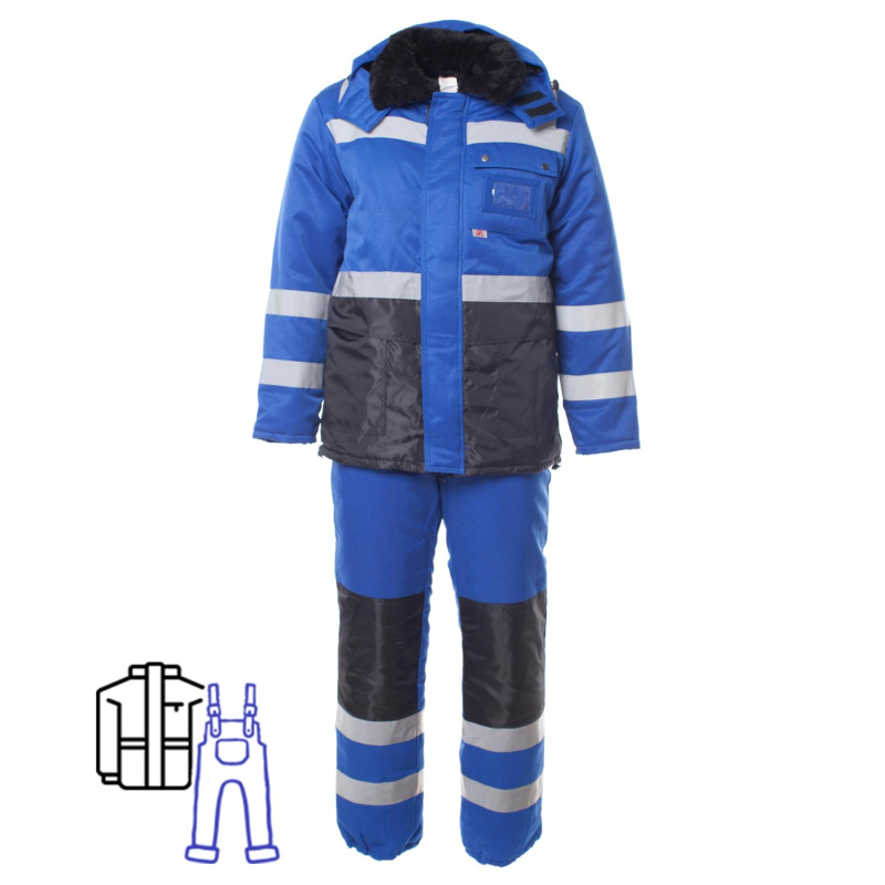Костюм рабочий зимний Алдан (куртка + полукомбинезон) василькового/черного цвета. Размер: 44-46. Рост: 170-176. Состав ткани: "Грета" смесовая (80% полиэстер, 20% хлопок, плотность 200 (плюс/минус) 10 г/кв.м, водоотталкивающая пропитка). Подкладка: "Спандбонд" (100% полиэстер, плотность 17 г/кв.м). Утеплитель: синтепон. Куртка: 600 г/кв.м. Полукомбинезон: 450 г/кв.м. Куртка удлиненная, прямого силуэта. Центральная застежка на тесьму "молния". Ветрозащитная планка с застежкой на ленту-контакт. Нагрудный карман с окном для бейджа, нижними накладными карманами. Регулировка прилегания куртки по талии и по низу полукомбинезона. Воротник меховой, капюшон утепленный, съемный. Манжеты: внутренние трикотажные. Полукомбинезон утепленный, с центральной застежкой на тесьму "молния". На передних половинках накладные карманы. Кулиса по талии спинки. Усилительные накладки в области колен. В костюме используется светоотражающая полоса 50 мм.
