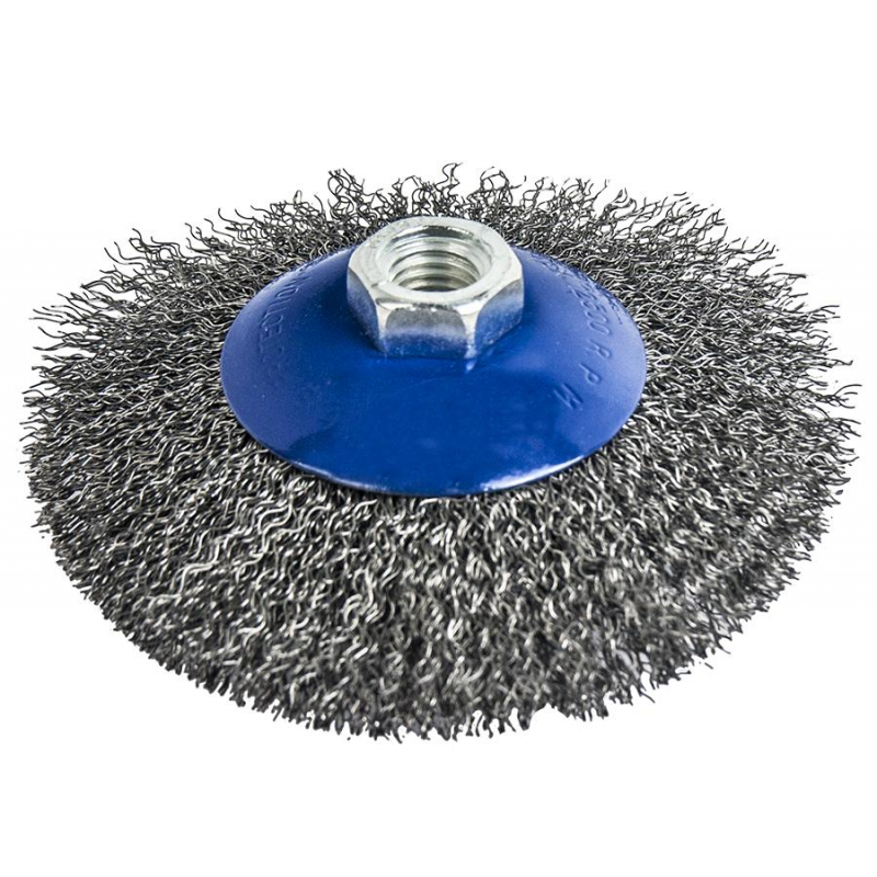 Корщетка для угловых шлифмашин. Резьбовая посадка на шпиндель. Гофрированная стальная проволока. Для обработки деревянных и металлических поверхностей в труднодоступных местах, снятия краски, ржавчины, обработки сварных швов.