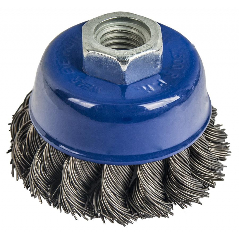 Корщетка для угловых шлифмашин со скоростью вращения до 12500 об/мин. Резьбовая посадка на шпиндель. Витая стальная проволока. Для грубой обработки дерева, снятия краски, шлифовки толстого металла, снятия ржавчины, окалины, обработки сварных швов.
