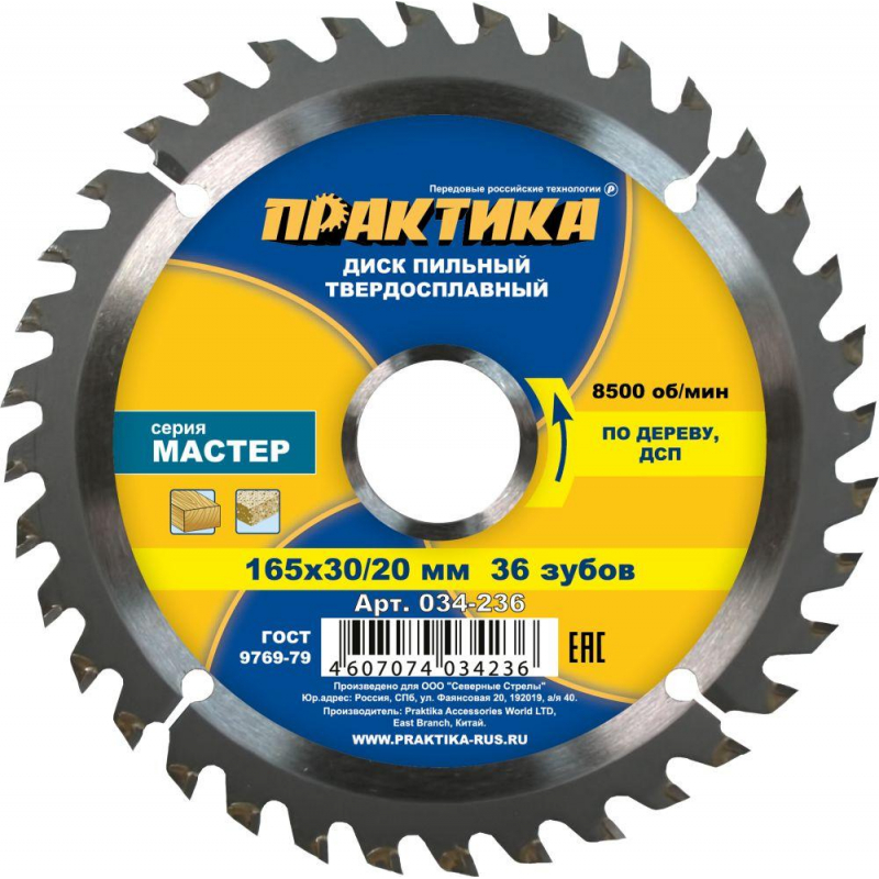 Диск пильный твердосплавный по дереву, ДСП ПРАКТИКА 165 х 30\20 мм, 034-236