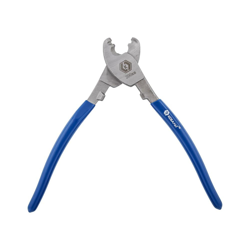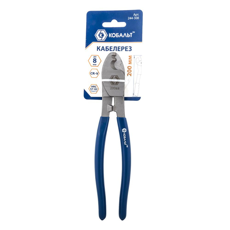 Кабелерез Кобальт 244-308 200 мм. Предназначен для точного аккуратного реза под прямым углом медных и алюминиевых кабелей диаметром до 8 мм (сечением до 38 мм2). Изготовлен из хром-ванадиевой стали (Сr-V) с закалкой лезвий до 57 HRC. Рукоятки покрыты ПВХ изоляцией, масса 0,3 кг.