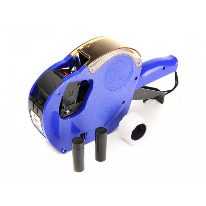 Этикет-пистолет MX-2612 быстро печатает липкие этикетки и наклеивает их на упаковку товара. Он служит для маркировки пищи, которая продается на развес. Эта модель применяется в розничных магазинах, в том числе в сетевых гипермаркетах и супермаркетах. Описание конструкции Корпус этикет-пистолета сделан из надежного пластика. Доступны два варианта дизайна корпуса: синий или красный. Благодаря эргономичной форме, модель хорошо ложится в руку. Для замены красящего ролика предусмотрен специальный механизм. Установка или замена осуществляется за несколько секунд. Главные характеристики модели: Тип механизма: однострочный. Символов в строке: 9. Размер этикетки: 26x12 мм. Прибор печатает цифры, буквы, разделительные знаки, денежные символы. В итоге получается этикетка с артикулом, ценой товара, дата продажи, номером отдела. Она плотно приклеивается к упаковке. Устройство работает с лентами с волнистыми краями шириной 26 мм. Предусмотрена вертикальная регулировка высоты печатной строки. Начало работы Для начала печати достаточно легкого нажатия на кнопку. Перед активацией нового пистолета требуется 20-30 раз нажать на ручку-рычаг, чтобы чернила поступили в печатающий механизм. Благодаря продуманной конструкции, сменный ролик нельзя установить неправильно.