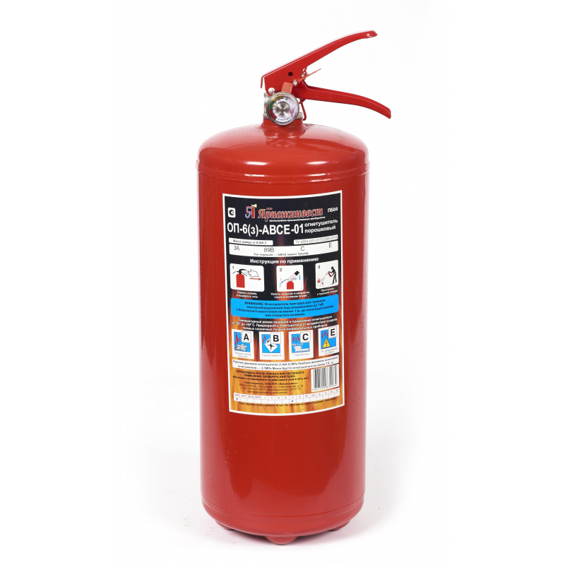 Огнетушитель порошковый ОП-6 (з) АВСЕ состоит из корпуса, наполненного огнетушащим веществом. Предназначен для защиты помещений производственного и хозяйственного назначения, применения на автомобильном, железнодорожном, речном транспорте, морских судах и в бытовых условиях в качестве первичных средств тушения пожаров классов А (твердых горючих веществ), В (жидких горючих веществ), С (газообразных горючих веществ) и электроустановок, находящихся под напряжением до 1000 В. Огнетушитель не предназначен для тушения загораний щелочных и щелочноземельных металлов и материалов, горение которых может происходить без доступа воздуха. Класс пожара: АВСЕ. Огнетушащая способность (ранг): 3А, 89В, С, Е. Огнетушащая способность (площадь): А-10,36 кв.м., В-2,75 кв.м. Вес: 8,3+/-0,3 кг. Масса заряда: 6+/-0,3 кг. Диаметр: 16 см. Время подачи огнетушащего вещества: 6 сек. Длина струи: 3 м. Перезаряжаемый. Гарантийный срок: 12 месяцев. Страна происхождения: Россия.Огнетушитель относится к сегменту "эконом". Качество соответствует заявленным характеристикам и стандарту ТР ЕАЭС 043/2017 "О требованиях к средствам обеспечения пожарной безопасности и пожаротушения