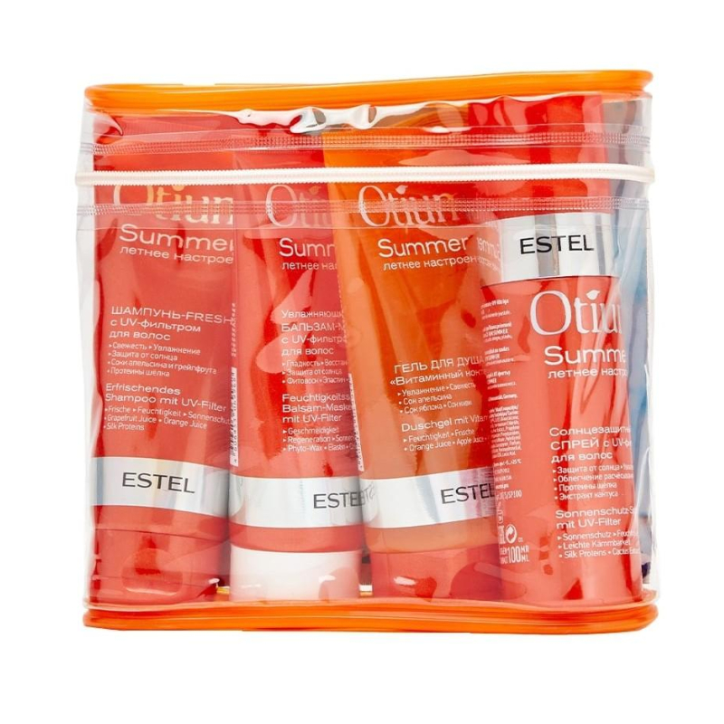 Поймать солнечное настроение. Зарядиться энергией на 365 дней. Это легко с Otium Summer. Фруктовые витамины, защита от солнца и чувство бесконечной свежести - то, что нужно волосам и коже в теплое время года. Линия Otium Summer с UV-фильтрами, натуральными соками и увлажняющими компонентами станет верным спутником лета и позволит максимально насладиться солнечными днями.В состав набора входят:Шампунь-fresh с UV-фильтром для волос, 100 мл. Мягко очищает, освежает и увлажняет кожу головы. Кондиционирует волосы, придает им гладкость. Оказывает антиоксидантное действие и увлажняет волосы и кожу головы.Увлажняющий бальзам-маска с UV-фильтром для волос, 100 мл. Создает защитный барьер от ультрафиолета. Придает блеск, гладкость и укрепляет. Эластин и коллаген интенсивно восстанавливают структуру волос, защищают от воздействия внешней среды.Солнцезащитный спрей с UV-фильтром для волос, 100 мл. Защищает волосы от выгорания и потери влаги. Увлажняет и поддерживает гидробаланс. Кондиционирует, облегчает расчесывание и придает гладкость.Гель для душа 'Витаминный коктейль', 100 мл. Бережно очищает кожу. Увлажняет, питает и заряжает фруктовой энергией.
