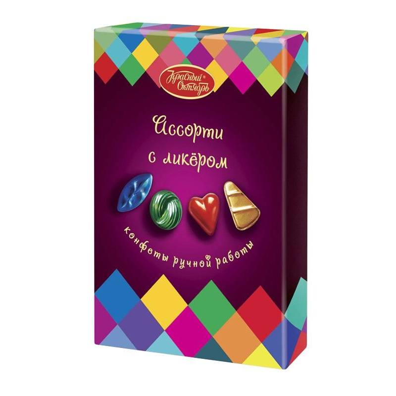 Ассорти конфет ручной работы с ликерной начинкой от знаменитой фабрики Красный октябрь. Состав набора: Конфета № 41 - шоколадные конфеты в форме лодочки из темного шоколада, с молочно-ликерной начинкой. В капсюле из темного шоколада, с рельефным рисунком на поверхности. Конфета № 50 - шоколадные конфеты в форме сердца из темного шоколада, с молочно-ликерной начинкой с лимонным вкусом. Поверхность декорирована белым шоколадом, подкрашенным желтым цветом. Конфета № 51 - шоколадные конфеты круглой формы из темного шоколада, с молочно-ликерной начинкой с вишневым вкусом. Поверхность декорирована белым шоколадом, подкрашенным зеленым цветом. Конфета № 52 - шоколадные конфеты треугольной формы с молочно-ликерной начинкой с кофейным вкусом. Конфеты из темного шоколада, с молочно-ликерной начинкой с добавлением экстракта кофе. Состав: темный шоколад (сахар, какао тертое, масло какао, эмульгатор лецитин соевый, ароматизатор "Ваниль"), сгущенное с сахаром молоко (молоко нормализованное, сахар (сахароза), сахар молочный (лактоза)), патока, заменитель молочного жира (растительные масла, в том числе соевое, антиокислители: лецитин подсолнечника, аскорбилпальмитат, токоферолы, концентрат смеси, лимонная кислота), коньяк (спирт коньячный выдержанный, сахарный сироп, краситель сахарный колер I, вода питьевая), вода питьевая, сахар, белый шоколад (сахар, масло какао, сухое цельное молоко, эмульгаторы: лецитин соевый, Е476; соль, ароматизаторы: "Ваниль", "Коньячный"), спирт этиловый ректификованный, масло какао, вишня сушеная (вишня, сахар, консервант - диоксид серы), сироп от варенья из апельсинов (вода питьевая, сахар, патока, апельсиновый сок, регулятор кислотности лимонная кислота, консервант Е202), кофе молотый, ароматизаторы: "Вишня в шоколаде", "Масло-сливки", "Лимон", "Ваниль", "Кофе", "Кофе капучино", красители: Е100, Е141(ii). Пищевая ценность 100 г продукта (средние значения), г: белки 5.0; жиры 26.0; углеводы 55.0, пищевые волокна 4.0, этанол 2.1. Энергетическая ценность 100 г продукта (средние значения): 2070 кДж (500 ккал). Вес: 280 г. Тип упаковки: подарочная картонная коробка 380x285x132 мм. Страна производства: Россия. Срок хранения: 120 дней. Условия хранения: хранить в сухих, чистых, хорошо вентилируемых помещениях, не имеющих посторонне##о запаха, не зараженных вредителями хлебных запасов, при температуре от 15°С до 21°С и относительной влажности не более 70%.