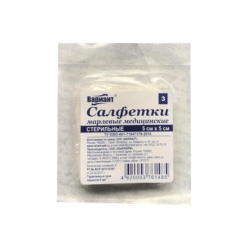 Марлевые салфетки 8-слойные, сложенные из полоски марли. Салфетка марлевая медицинская стерильная - применяется для использования в качестве готовых операционно-перевязочных средств, для наложения повязок, осушения ран, при перевязках и операциях, для тампонады с целью остановки кровотечения и дренирования, закрепления перевязочного материала, давления на какую-нибудь часть тела (в основном, для остановки кровотечения), предупреждения отека тканей или удержания конечности либо иной части тела в неподвижном состоянии, а также для защиты раны или измененной поверхности кожи от воздействия внешней среды - фиксируются бинтом или медицинским пластырем. Для обеспечения полной безопасности края салфеток марлевых сложены внутрь. Стерилизация радиационная. Наличие протокола стерилизации и инструкции по радиационной стерилизации медицинских изделий. Материал: 100% хлопок, отбеленный. Размер 5x5 см, 8 слоев, 17 нитей, 3 штуки в упаковке.