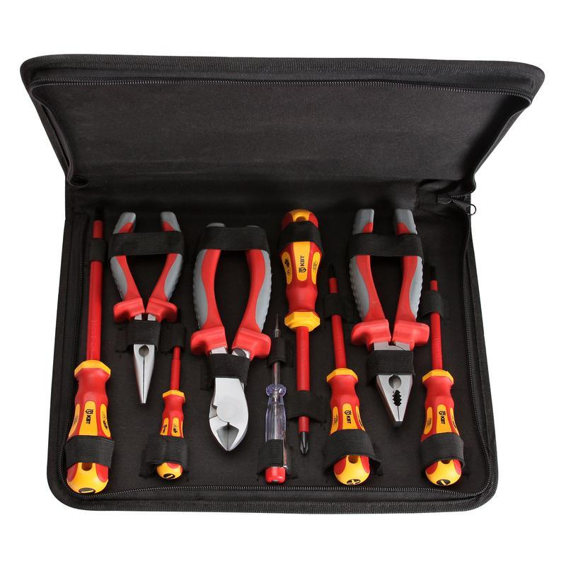 Набор инструмента электромонтажный КВТ 9 предметов (59380) данный комплект диэлектрического инструмента предназначен как для профессионального, так и для бытового использования. Все инструменты могут использоваться для работы под напряжением до 1000 В. Рабочие элементы инструментов выполнены из высококачественной стали. Набор снабжен кофром, выполненным из прочной ткани, для удобства хранения и переноски. Состав набора: диэлектрические пассатижи Стандарт 180 мм.; диэлектрические бокорезы усиленные Стандарт 180 мм.; диэлектрические длинногубцы Стандарт 160 мм.; диэлектрическая отвертка: шлиц 3x75; диэлектрическая отвертка: шлиц 4x100; диэлектрическая отвертка: шлиц 5. 5x125; диэлектрическая отвертка: PH1x80; диэлектрическая отвертка: PH2x100; отвертка-индикатор. Габариты упаковки: 340x260x40 мм.