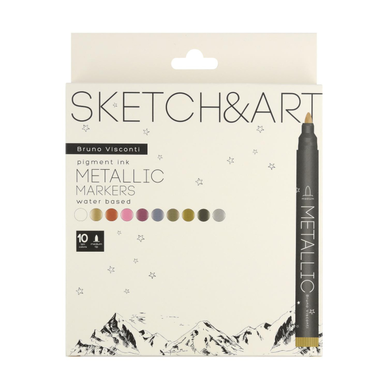 Высококачественные профессиональные металиизированные маркеры. Это идеальные маркеры для рисования и письма на любой поверхности. Они обладают великолепными кроющими свойствами, оставляя плотную линию на бумаге, пластике, керамике. Подходят как для прорисовки отдельных деталей, так и для создания масштабных изображений. Цвета великолепно смотрятся на черной бумаге, но подойдут и для счетллых поверхностей. Если вы планируете оформить открытку, меню, рекламную вывеску с цветной основой, то металлик- маркеры отлично подойдут для этих целей. Линия после высыхания получается с мягким металлическим блеском. При необходимости рисунки смываются водой с гладких глянцевых поверхностей, т.к. в маркерах металлик SKETCH&ART используются чернила на водной основе. Широкий круглый корпус отлично ложится в руку. Пулевидный наконечник с плотным фелтом позволяет контролировать четкость линии. В наборе 10 основных оттенков, в том числе серебряный и золотой.