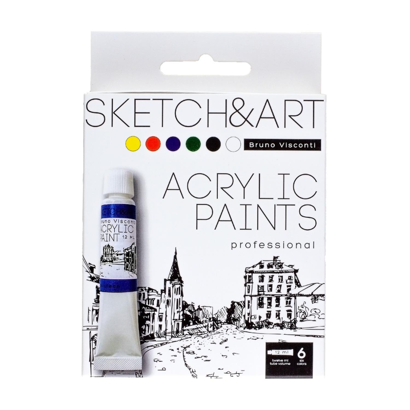 Акриловые краски предназначены для художественных и оформительских работ, прикладного искусства и детского творчества. Они подходят как для работы по бумаге и картону, так и для росписи деревянных поверхностей, холста, керамики, гипса и других материалов. Акриловыми красками можно успешно имитировать технику гуаши, акварели, масла. В процессе рисования их можно разбавлять водой или акриловым связующим. Хорошая кроющая способность, растворимость, водо- и светостойкость - все это выгодные преимущества красок от Bruno Visconti. Практичная и надежная упаковка - ПВХ тюбики по 12 мл - гарантия удобного использования и долгосрочного хранения. Набор из 6 тюбиков с красками базовых ярких цветов упакован в коробку-пенал с выдвижным пластиковым ложементом, удобную для использования и хранения красок. Цвета: lemon yellow, ultramarine blue, vermilion, grass green, black, titanium white.