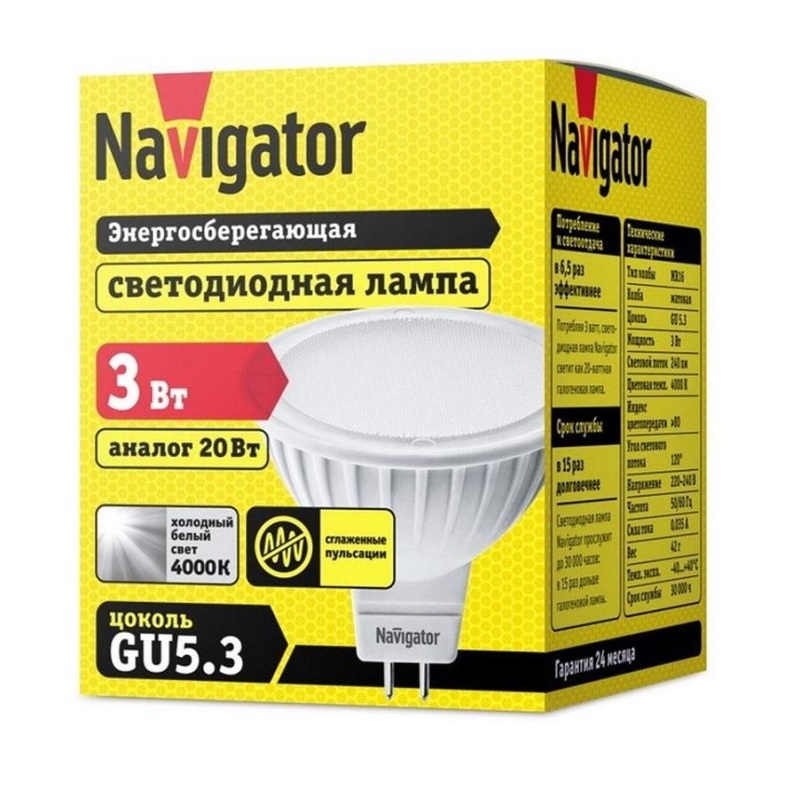 Лампа светодиодная Navigator NLL-MR16-7-230-4K MR 35Вт GU53 4000К 560Лм 230В 94245 Светодиодная лампа Navigator отличная причина для отказа от привычной лампочки накаливания. Лампа поможет существенно сократить потребление энергии без потери качества освещения. Благодаря форме колбы - рефлектор лампа находит применение в монтаже освещения в натяжных потолках, подвесных системах, точечных светильниках. Предназначена для создания мягкого приглушенного освещения, Матовая колба равномерно излучает нейтральный холодно-белый свет. Подходит для освещения жилых, офисных помещений. Преимущества: Экономит энергию, но не в ущерб качеству освещения; Подходит для осветительных приборов с типом цоколя GU5.3; Высокий индекс цветопередачи 80-89 Ra помогает в передать естественность цветов и оттенков; Цветовая температура 4000К, обеспечивает комфортное освещение не травмирующее зрение; Стеклянная матовая колба равномерно рассеивает световой поток; Высокий класс энергоэффективности; Диммирование позволяет плавно регулировать уровень освещенности; Срок использования 30000 часов. Применение: Общее освещение; Акцентное и декоративное освещение.