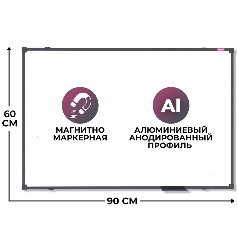 Стильная магнитно-маркерная доска Attache BlackFrame, 60x90 см, в черной алюминиевой раме. Настенная односекционная белая, без линовки. В основании доски прочная сотовая панель из картона толщиной 9,5 мм. Толщина металла 0,3 мм. Лаковое покрытие. Рама шириной (глубиной) 10 мм с прочными пластиковыми уголками. Магнитно-маркерная доска используется во время презентаций или для отображения материала, который нужно наглядно представить. Металлическая белая глянцевая поверхность позволяет крепить на доску важную информацию с помощью магнитов, использовать бумагу для заметок с клейким краем (стикеры) или писать специальными whiteboard маркерами сухого стирания, которые легко удаляются. Таким образом, на доске удобно размещать информацию, которая часто меняется. Эти доски используются для комфортной работы с информацией в организациях, учебных заведениях и домашних офисах. При удалении записей применяются только специальные губки-стиратели в комбинации со специализированным спреем для более тщательной очистки полотна (см. вкладку 'Расходные материалы'). Для продления срока службы доски рекомендуется использовать фирменные маркеры и губки. Соблюдение правил ухода и эксплуатации способно обеспечить срок службы рабочей поверхности магнитно-маркерной доски более 10 лет. В комплекте съемная полка для маркеров, набор для навесного крепления, инструкция по установке. Расположение горизонтальное/вертикальное. Страна-производитель - Россия. Поставляется готовой для использования. Не требует дополнительных манипуляций по отделению защитных слоев с пишущих поверхностей.