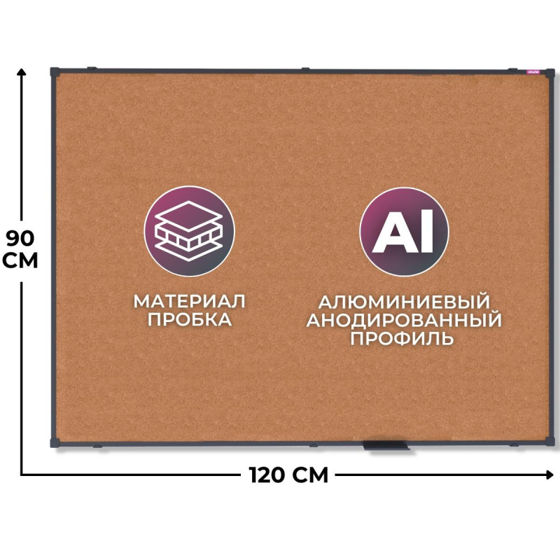 Стильная пробковая доска Attache BlackFrame, 90x120 см в черной алюминиевой раме. В основании прочная ДВП панель толщиной 8 мм. Толщина натуральной пробки 1мм. Металлическая рама шириной (глубиной) 10 мм из анодированного алюминия с прочными пластиковыми уголками. В комплекте набор для навесного крепления, инструкция по установке. Расположение горизонтальное/вертикальное. Пробковые доски - один из самых популярных атрибутов современного офиса и дома. Благодаря использованию натуральных материалов, они отличаются стильным внешним видом и прекрасно вписываются в любой интерьер. Такие доски используют для организации рабочего места, как дома, так и в офисе, а также в качестве информационных стендов. Документы, объявления, записки и фотографии легко крепятся с помощью силовых кнопок. Страна-производитель - Россия.