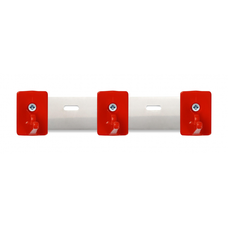 Держатель настенный предназначен для хранения производственного и уборочного инвентаря, инструментов. Размер держателя с крючками (ДхШ): 192х77 мм. Вес: 167 г. Цвет: красный/металлик. Максимальная нагрузка на 1 крючок: 10 кг. В комплект входит 3 крючка, крепежный набор. Возможно доукомплектование дополнительным набором крючков для хранения 5 предметов. Гигиеничен, легко моется, изготовлен из материалов, устойчивых к агрессивным моющим растворам - нержавеющей стали, полипропилена. Подходит для пищевых производств, HoReCa, клининга.
