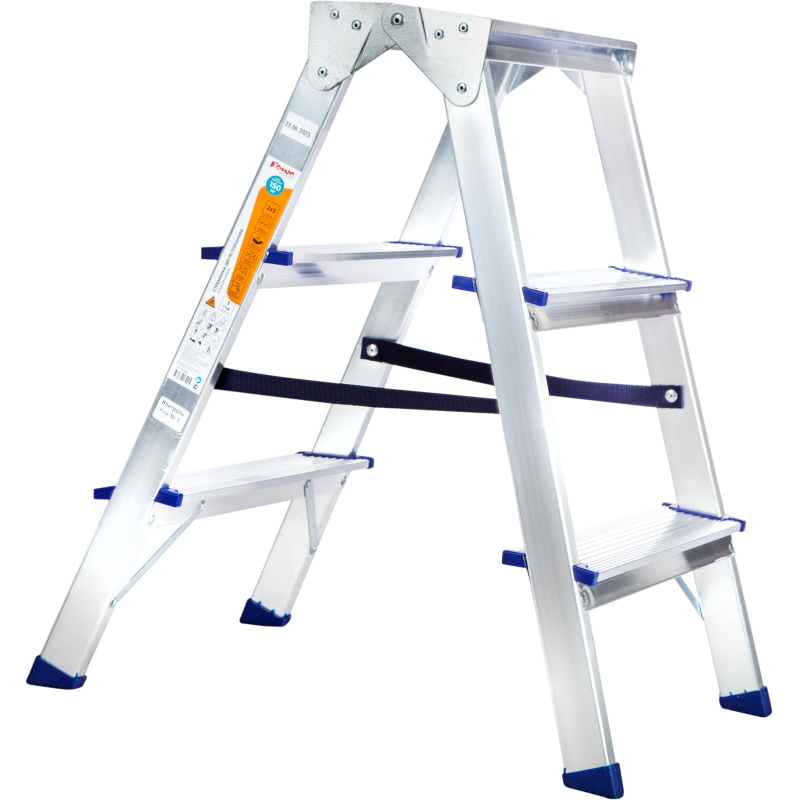Стремянка алюминиевая 3 ступени имеет рифленую поверхность рабочей площадки для предотвращения скольжения. Прочное крепление ступеней к боковинам придает конструкции высокую жесткость. Профилированные, противоскользящие наконечники опор для защиты пола. Профессиональная серия. Усиленные стальные кронштейны и профиль толщиной 1,25 мм. Надежная фиксация при раскрывании за счет наличия страховочной стяжки из прочной ленты. Подходит для частого использования. Гарантия 2 года.