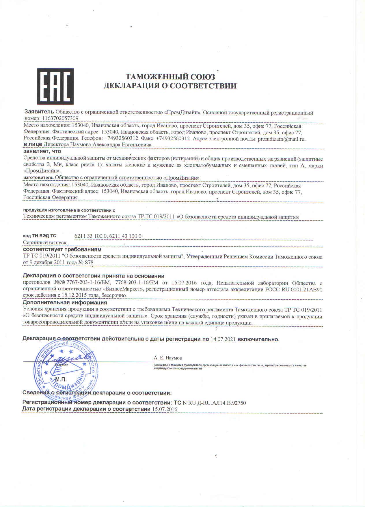 Сертификат на товар - Халат рабочий женский у02-ХЛ синий (размер 60-62, рост 170-176)