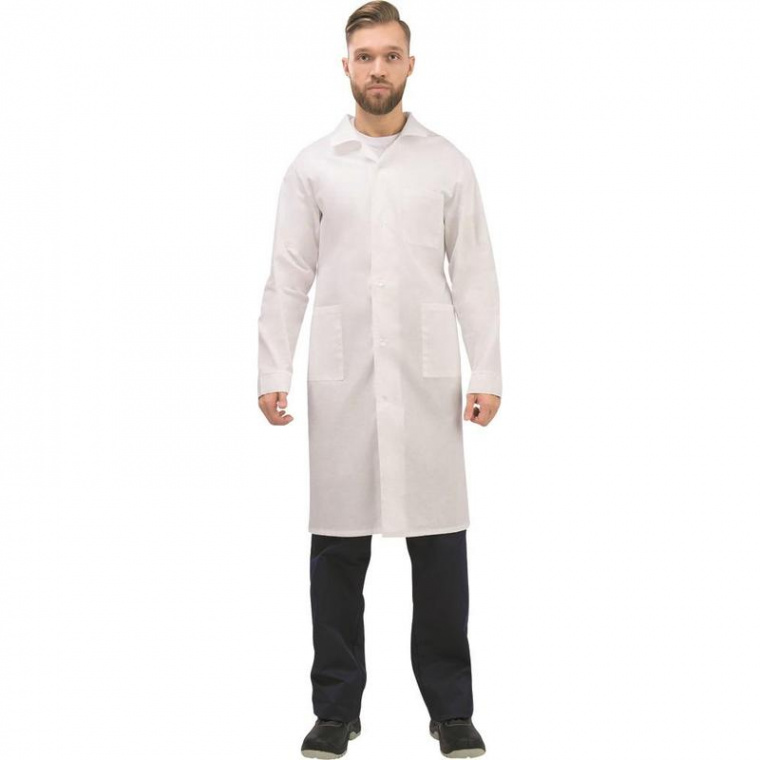 Халат рабочий мужской предназначен для защиты от общих промышленных загрязнений и механических воздействий кожи и одежды. Халат рабочий мужской востребован в разных отраслях промышленности, начиная от маляров и заканчивая инженерами и строителями. Белый мужской рабочий халат классического прямого покроя длиной по колено, застегивается спереди на пуговицы. Воротник — отложной. Имеет длинные рукава с манжетами на манжете. 2 кармана спереди для мелочей. Изделие, предназначено для использования в летний сезон, выполнено из гладкокрашенной бязи (100 хлопка плотностью 142 г/кв.м.). Высокопрочная, экологичная, гигроскопичная ткань изготовлена в соответствии с ГОСТом. Халат белого цвета 56–58 размера рассчитан на рост 182–188 см. Температурный режим стирки — не выше 40 градусов.