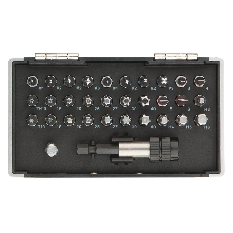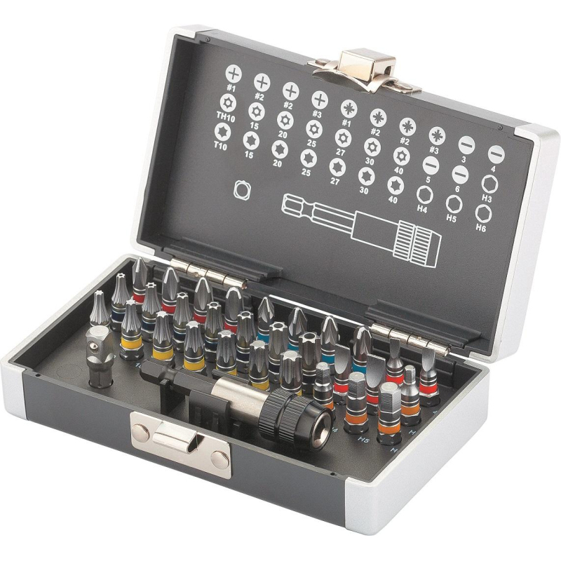 Набор бит с магнитным адаптером Gross 11363 предназначен для монтажа и демонтажа резьбовых соединений с помощью шуруповерта. Он подойдет для ремонтных, монтажных и слесарных работ, в том числе для сборки мебели, бытовых электроприборов, самокатов и велосипедов и т.д.. В комплект входят биты самых актуальных размеров, переходник с шестигранника на квадрат 1/4 и магнитный адаптер для бит. Преимущества В одном наборе представлено 6 типов бит: PH и PZ калибров 1-3, SL калибров 3, 4, 5, 6, TORX и TORX Tamper (10, 15, 20, 25, 27, 30, 40), HEX 3-6. Самые ходовые размеры PH2 и PZ2 поставляются по 2 штуки. Высококачественная японская легированная сталь S2 обеспечивает повышенную прочность, износостойкость и долгий срок службы бит. За счет металлического шарика-фиксатора переходник надежно удерживает торцевые головки (в комплект не входят). Битодержатель с магнитом и быстрозажимным механизмом обеспечивает устойчивую фиксацию насадок, что важно при работе в труднодоступных местах. Битодержатель выполнен из высококачественной стали и покрыт хромом для защиты от коррозии. Для удобного и бережного хранения комплект поставляется в кейсе из ударопрочного пластика с металлическим замком-застежкой. Схема комплекта по типоразмерам напечатана на крышке кейса, благодаря чему после использования биты удобно раскладывать по местам.