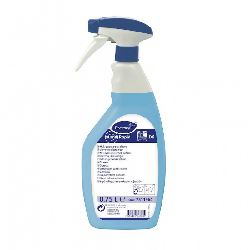 Средство для мытья стекол и зеркал Diversey Suma Rapid D6 750 мл (готовое к применению средство). Назначение: средство Suma Rapid D6 является готовым к применению спрейным чистящим средством, предназначенным для чистки стеклянных и других водостойких твердых поверхностей на кухне, в ресторанах и кафе. Не оставляет разводов. Свойства: отлично удаляет отпечатки пальцев, а также другие легкие жировые загрязнения. Легко распыляется, легко удаляется. Подходит для использования на различных водостойких поверхностях, например, стеклах, зеркалах, глазурованной керамической плитке, а также на пластиковых поверхностях. Способ применения: нанести продукт в неразбавленном виде. Распылить небольшое количество на поверхность и начисто вытереть мягкой безворстной салфеткой. При необходимости повторить точечную процедуру нанесения на оставшиеся загрязнения. Перед применением рекомендуется проверить очищаемую поверхность на совместимость на небольшом участке, в незаметном месте. В соответствии с рекомендуемыми условиями правилами средство Suma Rapid D6 совместимо со всеми водостойкими материалами и поверхностями. Не использовать на чувствительных к воде материалах, таких как дерево и пробка. Срок годности: 2 года от даты изготовления (при соблюдении условий транспортировки и хранения).