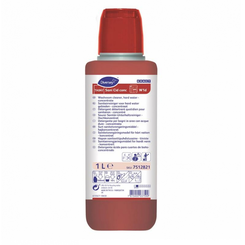 Средство для мытья сатнехники Diversey TASKI Sani Cid conc 1 л (концентрат). Назначение: концентрированное моющее средство на основе лимонной кислоты для ежедневной уборки санитарных помещений (уборных, ванных, умывальных), применяемое для обработки любых поверхностей, устойчивых к воздействию кислоты, и используемое в местах с жесткой водой. Его особый состав обеспечивает прекрасные чистящие свойства, а также предотвращает отложение известкового осадка, особенно в условиях жесткой воды. Область применения: для применения на объектах ЖКХ, предприятиях общепита и пищевой промышленности, пищевых производствах, в торговле, ресторанах, столовых, объектах социального обеспечения, в гостиницах, офисах, образовательных учреждениях (включая школьные и дошкольные), ЛПУ, согласно рекомендациям производителя. Свойства: обладает свойствами, обеспечивающими эффективную очистку и удаление налета в местах с жесткой водой. Подходит для обработки сантехники, с хромированным покрытием или целиком изготовленных из нержавеющей стали. Оставляет после применения приятный аромат. Дозирующий колпачок на бутылке для точной дозировки и контроля расхода. Способ применения: минимальная дозировка: 2 колпачка на 10 л воды (0,2 %). При большом количестве осадка/сильном загрязнении увеличить дозировку. При помощи распылителя: 1 колпачок на бутылку, наполненную 500 мл воды (2 %). При помощи распылителя: добавить необходимое количество средства в бутылку с насадкой для пены, распылить раствор на влажную салфетку, протереть поверхность. Регулярно полоскать или заменять салфетку по мере загрязнения. Использовать губку для удаления устойчивых загрязнений. При помощи ведра: добавить необходимое количество средства в наполненное водой ведро, нанесите раствор на загрязненную поверхность при помощи салфетки/губки и протереть ее. Использовать губку для удаления устойчивых загрязнений. Влажная уборка при помощи швабры: добавить необходимое количество средства в ведро, наполненное водой. Нанести раствор на загрязненную поверхность при помощи швабры и удалите загрязнившийся раствор. Срок годности: 2 года с момента производства (при соблюдении условий хранения, рекомендованных производителем).