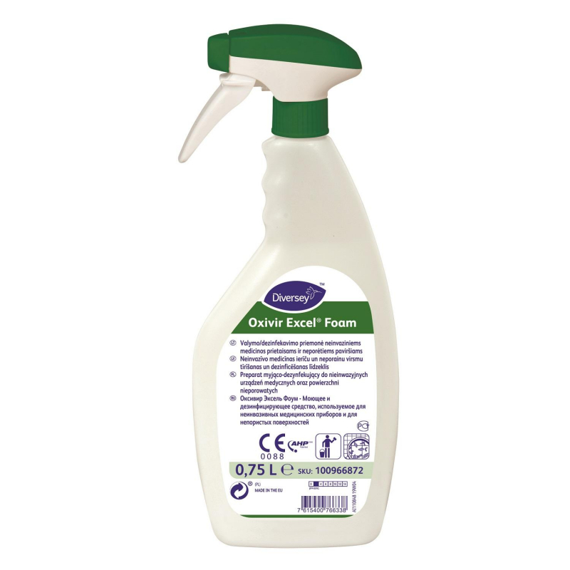 Средство для дезинфекции поверхностей и оборудования Diversey Oxivir Excel Foam 750 мл (готовое к применению средство). Назначение: готовое к применению дезинфицирующее средство широкого спектра действия с моющим эффектом и коротким временем обеззараживания для дезинфекции непористых поверхностей и жесткой мебели. Используется для проведения генеральной уборки. Свойства: широкий спектр действия дезинфектанта обеспечивает высочайший уровень защиты больничного пациента. Эффективность действия подтверждена многочисленными испытаниями в соответствии с нормами ЕС. Средство эффективно борется с большим количеством патогенов и вирусов, включая полиомиелит, аденовирус, рото- и норовирус, ВИЧ, грипп типа А, возбудителями ОРВИ и герпес и фунгицидной активностью. Благодаря короткому времени обеззараживания поверхность остается влажной, что повышает эффективность дезинфекции. Показывает отличные результаты чистки, в том числе удаляет отложения и препятствует их образованию, что устраняет необходимость предварительной чистке поверхности. Безопасность для пользователя снижает риск производственных травм, средство не классифицировано как опасное, не содержит компоненты, раздражающие органы дыхания. Формула средства на основе стабилизированной перекиси водорода не портит поверхности и тем самым продлевает срок службы оборудования. Способ применения: 1. Удалить крупные видимые загрязнения. 2. Предварительно распылив на салфетку, протереть поверхность или распылить непосредственно на поверхность с помощью бутылки с распылителем с последующим протиранием салфеткой. 3. Выдержать время обеззараживания (поверхность должна быть влажной во время обеззараживания). В некоторых случаях промыть водой и протереть насухо. Срок годности: 2 года с момента производства (при соблюдении условий хранения, рекомендованных производителем).