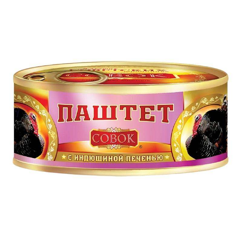 Паштет Совок с индюшиной печенью 130 г. Состав: печень птицы, мясо птицы механической обвалки, шпик, кожа птицы, шкурка свиная, вода, крупа манная, крахмал картофельный, мука пшеничная, лук, соль, сахар, пищевая добавка загуститель Е407, комплексная пищевая добавка (экстракты приправ, эмульгатор Е472с, усилитель вкуса Е621). Пищевая ценность на 100 г продукта: белки - 9 г, жиры - 13 г. Энергетическая ценность на 100 г продукта: 153 ккал, 641 кДж. Хранить при температуре от 0 до 20°C и относительной влажности воздуха не более 75%. Страна производства: Россия.