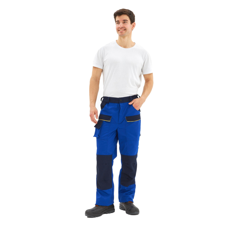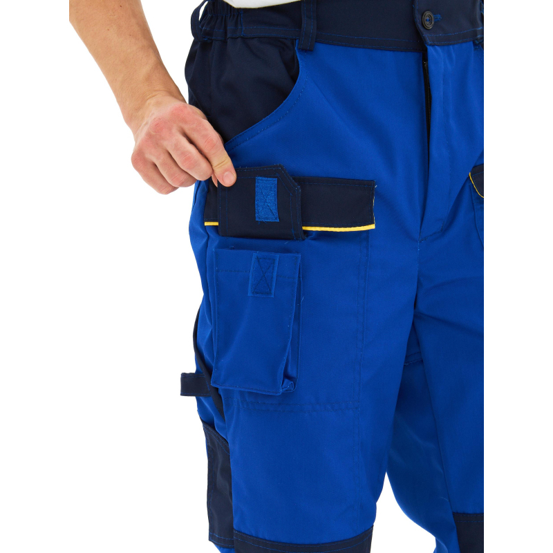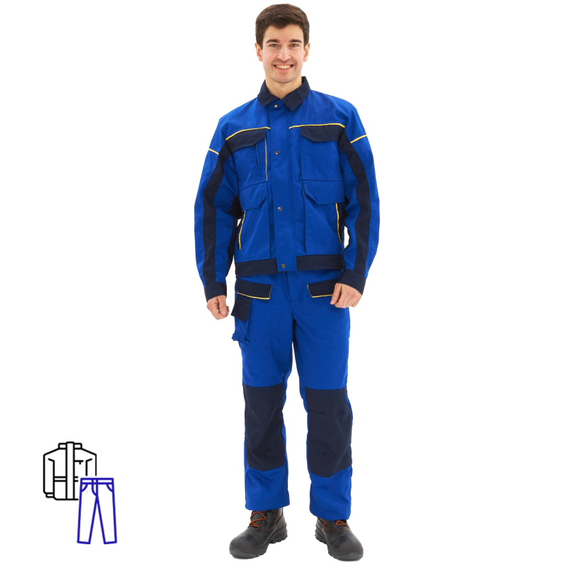 Спецодежда летняя костюм мужской л31-КБР (куртка+брюки). Размер: 44-46. Рост: 182-188. Цвет: синий/васильковый. Состав ткани: 65% полиэстер, 35% хлопок. Плотность: 240 г/кв.м. Куртка прямого силуэта. Полочки с отрезными кокетками из ткани основного цвета и кантом желтого цвета , нагрудными накладными карманами из ткани отделочного цвета. Нагрудный карман правой полочки имеет дополнительный карман на застежку молния с клапаном на контактную ленту 25 мм и петлей. Нагрудный карман левой полочки имеет дополнительный объем и клапан на застежку контактная лента 25 мм. Нижние карманы куртки накладные, сложные, имеют дополнительный объем, двойной вход сверху и сбоку (листочка) и клапана из ткани основного цвета на застежку контактная лента 25 мм. Спинка с кокеткой отделочного цвета, нижняя часть спинки с боковыми складками для объема. Рукава втачные с манжетами и шлицей в нижней части локтевого шва с притачной планкой отделочного цвета , застежка манжет на контактную ленту. Рукав 4 шовный со вставками из ткани отделочного цвета. Воротник отложной. Застежка борта на молнию с ветрозащитным клапаном на контактную ленту 25 мм и кнопку на поясе и в верхней части планки. Низ куртки на поясе. Пояс с двумя патами, регулирующими ширину пояса, застежка пат на кнопку. Брюки прямого силуэта. Передние половинки брюк имеют верхние внутренние карманы, с бочком из отделочной ткани, врезные карманы с клапанами из отделочной ткани и накладным объемным карманом справой стороны. Наколенники выполнены из ткани отделочного цвета, имеют вытачки для свободы движения и карман для защитного наколенника с застежкой на контактную ленту 25 мм. Задние половинки брюк с отрезной кокеткой из ткани отделочного цвета, имеют накладные карманы с фигурными клапанами основного цвета с застежкой на контактную ленту 25 мм. По боковым швам два накладных кармана для инструментов из ткани отделочного цвета. По линии талии пояс с пятью шлевками, в боковой части пояса - эластичная тесьма. Застежка пояса на 1 пуговицу и 1 прорезную петлю. Застежка гульфика на молнию. Сферы применения: автомобильная, ЖКХ, легкая промышленность, логистика, нефтегазовая, озеленение, сельское хозяйство, строительство.