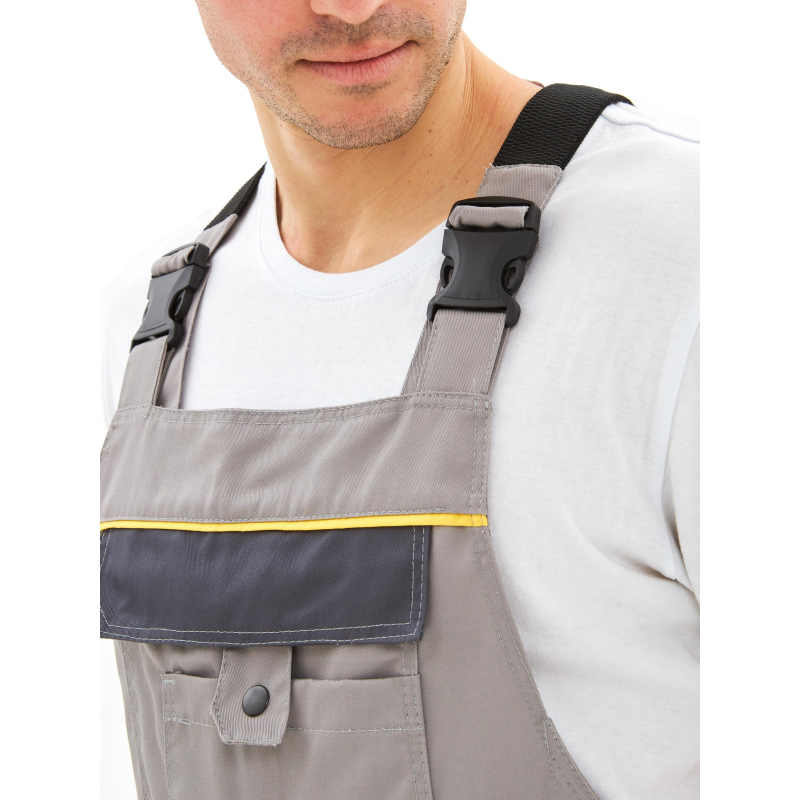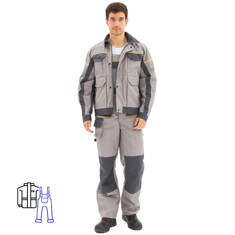 Спецодежда летняя костюм мужской л31-КПК (куртка+полукомбинезон). Размер: 60-62. Рост: 182-188. Цвет: светло-серый/серый. Состав ткани: 65% полиэстер, 35% хлопок. Плотность: 240 г/кв.м. Куртка прямого силуэта. Полочки с отрезными кокетками из ткани основного цвета и кантом желтого цвета, нагрудными накладными карманами из ткани отделочного цвета. Нагрудный карман правой полочки имеет дополнительный карман на застежку молния с клапаном на контактную ленту 25 мм и петлей. Нагрудный карман левой полочки имеет дополнительный объем и клапан на застежку контактная лента 25 мм. Нижние карманы куртки накладные, сложные, имеют дополнительный объем, двойной вход сверху и сбоку (листочка) и клапана из ткани основного цвета на застежку контактная лента 25 мм. Спинка с кокеткой отделочного цвета, нижняя часть спинки с боковыми складками для объема. Рукава втачные с манжетами и шлицей в нижней части локтевого шва с притачной планкой отделочного цвета , застежка манжет на контактную ленту. Рукав 4 шовный со вставками из ткани отделочного цвета. Воротник отложной. Застежка борта на молнию с ветрозащитным клапаном на контактную ленту 25 мм и кнопку на поясе и в верхней части планки. Низ куртки на поясе. Пояс с двумя патами, регулирующими ширину пояса, застежка пат на кнопку. Полукомбинезон прямого силуэта. Грудка отрезная с накладным фигурным карманом с клапаном отделочного цвета застежка клапана на контактную ленту. Передние половинки со сложными боковыми карманами и наколенниками. Наколенники выполнены из ткани отделочного цвета, имеют вытачки для свободы движения и карман для защитного наколенника с застежкой на контактную ленту 25 мм. Задние половинки имеют накладные карманы с фигурными клапанами основного цвета с застежкой на контактную ленту 25 мм. Бретели полукомбинезона с закрытой резинкой, застежка бретелей на пряжки - фастексы. Боковая застежка на 2 петли-пуговицы. Сферы применения: автомобильная, ЖКХ, легкая промышленность, логистика, нефтегазовая, озеленение, сельское хозяйство, строительство.