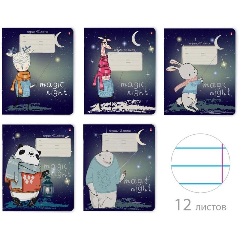 ?Школьная тетрадь А5 (165x203 мм) из коллекции Magic night в линейку, 12 листов. Внутренний блок на скрепках - бумага писчая-офсет 60 г/кв.м, белизна - 100%. Есть место для подписи. Обложка тетради из плотно??го?? мелованного картона 190 г/кв.м. Внутри - блок из белой бумаги в линейку с красными полями.? ?Внимание! Товар поставляется в различных вариантах дизайна/цвета (без возможности выбора).?