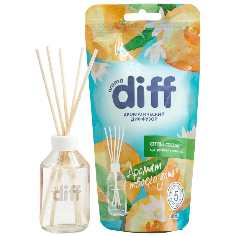 Ароматический диффузор Diff с ароматом "Цитрусовый коктейль". Безопасный. Экологически чистый. Натуральный. Является прекрасной альтернативой ароматизированным спреям. Описание аромата: сочный цитрусовый коктейль, апельсин, грейпфрут, мандарин, яблоко, роза, кедр, мускус. Флакона объемом 50 мл хватит на помещение площадью до 15 кв.м. Чтобы наслаждаться потрясающим ароматом, необходимо просто поставить палочки во флакон и дождаться, пока аромат полностью наполнит пространство вокруг. Палочки важно применять сразу все и периодически переворачивать, чтобы поддерживать уровень ароматизации на должном уровне (1-2 раза в сутки).