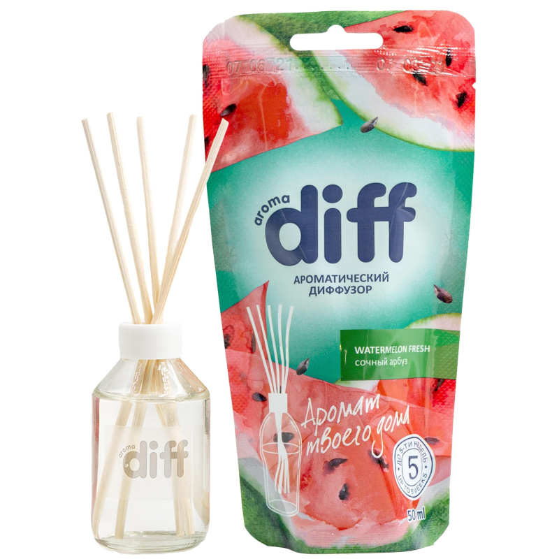 Ароматический диффузор Diff с ароматом "Сочный арбуз". Безопасный. Экологически чистый. Натуральный. Является прекрасной альтернативой ароматизированным спреям. Описание аромата: апельсин, персик, арбуз, дыня, миндаль, ваниль, сандал, мускус. Флакона объемом 50 мл хватит на помещение площадью до 15 кв.м. Чтобы наслаждаться потрясающим ароматом, необходимо просто поставить палочки во флакон и дождаться, пока аромат полностью наполнит пространство вокруг. Палочки важно применять сразу все и периодически переворачивать, чтобы поддерживать уровень ароматизации на должном уровне (1-2 раза в сутки).