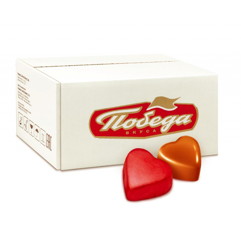 Конфеты в виде шоколадного 'сердечка' с нежным вкусом натурального молочного шоколада с ароматной ореховой начинкой. Состав: шоколад (сахар, тертое какао, масло какао, сыворотка молочная сухая, сухое обезжиренное молоко, какао-порошок, молочный жир, эмульгатор (лецитин соевый), ароматизатор (ванилин)), арахис, жир растительный, сыворотка молочная сухая, лесной орех (фундук) тертый, эмульгатор (лецитин соевый), ароматизатор (ванилин). Пищевая ценность в 100 г: белки - 8.0 г, жиры - 34 г, углеводы - 51 г. Срок годности: 12 месяцев. Энергетическая ценность: 540 ккал (2260 кДж). Хранить при температуре 18+/-3°C и относительно влажности воздуха не более 75%. Избегать воздействия прямых солнечных лучей. Страна производства: Россия.