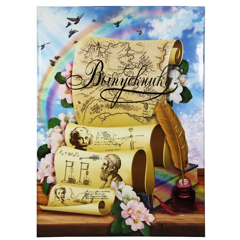 Папка формата А4 выполнена из плотного ламинированного картона. На обложке надпись 'Выпускнику' (тиснение золотой фольгой) и тематическое изображение.