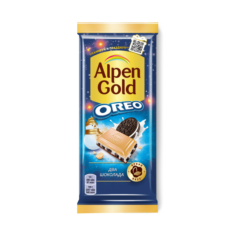 Любимый вкус Oreo с нежным белым и молочным шоколадом Alpen Gold. Пищевая ценность: жиры - 31 г, белки - 4.2 г, углеводы - 61 г. Энергетическая ценность на 100 г: 540 ккал. Хранить не более 275 дней при температуре от +10 до +20 °C. Вес: 90 г. Страна производства: Россия.