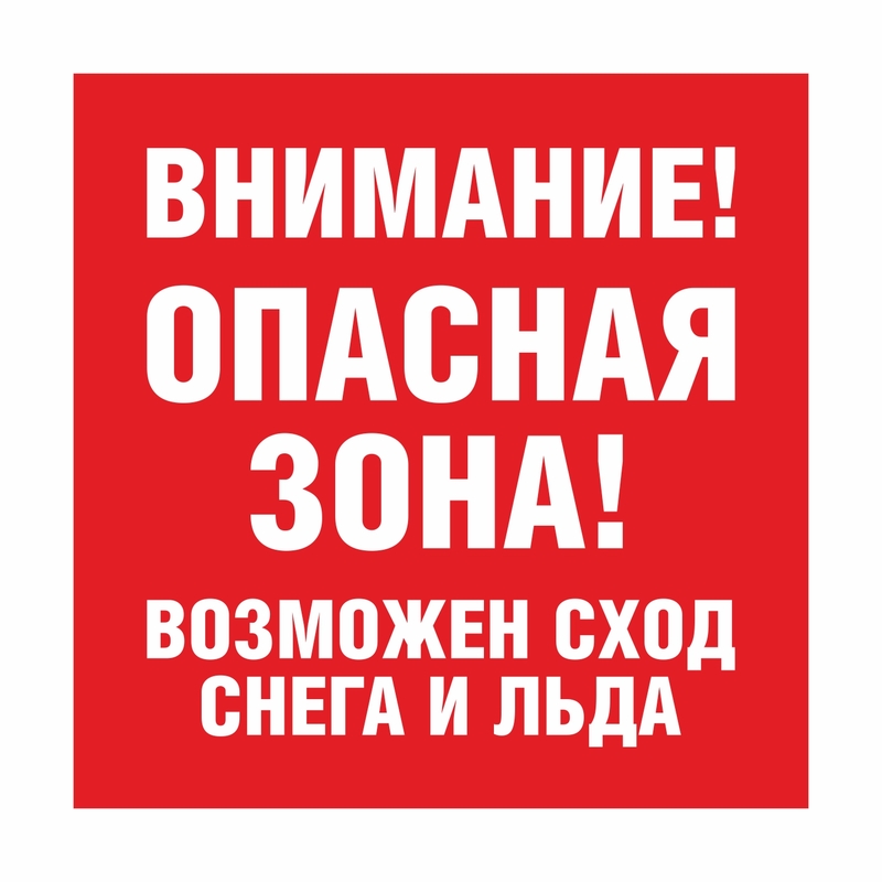 Знак безопасности "Осторожно сход снега и наледи с кровли" предупреждает о возможном падении снега и сосулек с кровли и информирует о должной осмотрительности граждан. Материал пластик 2 мм + световозвращающая пленка. Знак без подвесов и креплений. Формат знака: 400х400 мм.
