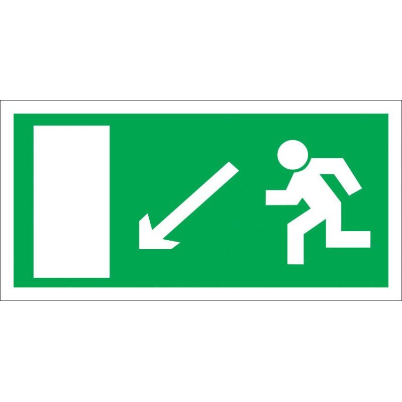 Эвакуационный знак безопасности (наклейка) 'Направление к эвакуационному выходу налево вниз'. Код знака: Е08. Место размещения (установки) и рекомендации по применению: на стенах помещений для указания направления движения к эвакуационному выходу по наклонной плоскости. Используемые материалы: самоклеящаяся пленка ПВХ. Формат: 150x300 мм. Упаковка 10 шт.