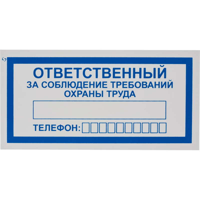 Знак безопасности 'Ответственный за соблюдение требований охраны труда'. Код знака: V57. Знак изготовлен из самоклеящейся пленки. Формат: 100x200 мм. Упаковка 10 шт.