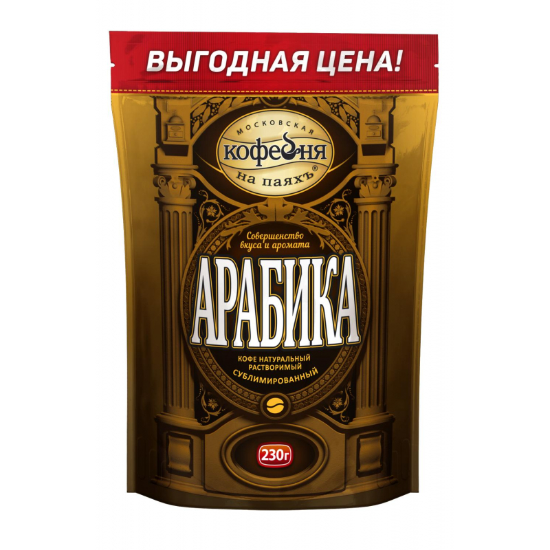 Кофе Московская кофейня на паяхъ "Арабика" натуральный растворимый сублимированный. Приготовлен из высокогорной Колумбийской арабики. Благодаря традиционной обжарке имеет насыщенный мягкий вкус с приятными винными тонами и чистый натуральный аромат настоящего кофе арабика. Состав: 100% арабика. Способ приготовления: в чашку насыпьте 1-2 чайные ложки кофе. Залейте горячей, но не кипящей водой. Сахар и сливки добавьте по вкусу. Вес: 230 г. Тип упаковки: вакуумный пакет. Условия хранения: плотно закрытый пакет хранить в сухом прохладном месте. Страна производства: Россия. ГОСТ 32776-2014.