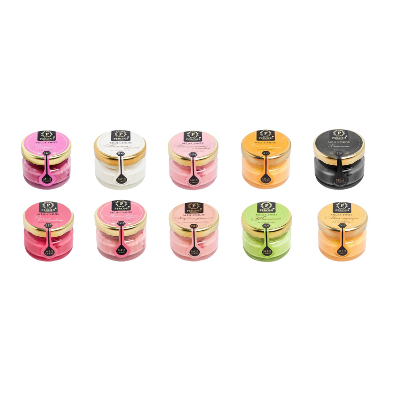 Набор Ассорти Peroni № 2 - десять баночек меда-суфле разных вкусов в одном наборе. Отличная возможность попробовать все и выбрать своего фаворита. Мед-суфле - натуральный, полезный и вкусный десерт, в котором собрана польза меда и орехов, ягод и высушенных фруктов, входящих в его состав. Мед является природным энергетиком и помощником организма в восстановлении энергозапаса, поднятии общего тонуса и иммунитета. Он поможет для стимуляции умственной деятельности и при физических нагрузках. Мед-суфле изготавливается по технологии бережного холодного вымешивания. Натуральный мед долго вымешивается при невысоких температурах, к нему добавляются высушенные фрукты, ягоды, орешки и потом он уже в баночках "засахаривается" в нежном кремовом виде. Благодаря этому получается та самая воздушная текстура, все витамины и польза сохраняются, так как нет перегрева. В состав набора Ассорти Peroni № 2 входит 10 видов меда-суфле: Манго маракуйя 30 г. Состав: 94,9% - натуральный цветочный крем-мед, 5% - манго сушеный, 0,1% - экстракт маракуйя. Пищевая ценность на 100 г: углеводы - 75 г, белки - 0,3 г, жиры - 0,4 г. Энергетическая ценность: 330 ккал. Молочный цветок 30 г. Состав: 95% - натуральный цветочный крем-мед, 5% - сухое молоко. Пищевая ценность на 100 г: углеводы - 75 г, белки - 1 г. Энергетическая ценность: 292 ккал. Фисташка 30 г. Состав: крем - мед 89,9%, измельченные фисташки 10%, хлорофилл 0,1%. Пищевая ценность на 100 г: углеводы - 75 г, белки - 2 г, жиры - 0,4 г. Энергетическая ценность: 365 ккал. Клубника-земляника 30 г. Состав: 90% - натуральный цветочный крем-мед, 5% - клубника сушеная, 5% - земляника сушеная. Пищевая ценность на 100 г: углеводы - 75 г, белки - 0,3 г, жиры - 0,4 г. Энергетическая ценность: 330 ккал. Малиновый сорбет 30 г. Состав: 90% - натуральный цветочный крем-мед, 10% - малина сушеная. Пищевая ценность на 100 г: углеводы - 75 г, белки - 0,3 г, жиры - 0,4 г. Энергетическая ценность: 320 ккал. Смородина 30 г. Состав: 90% - натуральный цветочный крем-мед, 10% - смородина сушеная. Пищевая ценность на 100 г: углеводы - 75 г. Энергетическая ценность: 302 ккал. Сицилийский апельсин 30 г. Состав: крем - мед 89,9%, сушеный апельсин 10%, куркумин 0,1%. Пищевая ценность на 100 г: углеводы - 75 г, белки - 0,3 г, жиры - 0,4 г. Энергетическая ценность: 302 ккал. Хани-кола 30 г. Состав: мед - 99,8%, раститель##ый уголь - 0,1%, экстракт рома - 0,01%, экстракт колы - 0,01%, экстракт ванили - 0,01%. Пищевая ценность на 100 г: углеводы - 75 г, белки - 0,8 г. Энергетическая ценность: 320 ккал. Пряный глинтвейн 30 г. Состав: мед 98,7%, экстракт черной моркови 0,1%, гвоздика 0,05%, экстракт вина 0,05%, цедра апельсина 1%, корица 0,05%. Пищевая ценность на 100 г: углеводы - 75 г, белки - 0,3 г, жиры - 0,4 г. Энергетическая ценность: 302 ккал. Космополитен с клюквой 30 г. Состав: 90% - натуральный цветочный крем-мед, 10% - клюква сушеная. Пищевая ценность на 100 г: углеводы - 75 г, белки - 0,3 г, жиры - 0,4 г. Энергетическая ценность: 330 ккал. Стеклянные баночки объемом 30 мл с завинчивающимися крышками вложены в пластиковую упаковку размером 23x9х4 см. Срок и условия хранения меда-суфле: 12 месяцев при температуре не выше 20°C. Страна производства Россия.