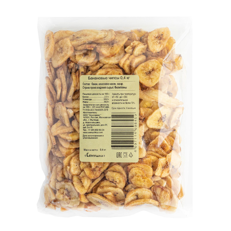 Банановые чипсы Семушка 400 г. Состав: банан, кокосовое масло, сахар. Пищевая ценность: белки - 2,3 г, жиры - 34 г, углеводы - 58 г. Энергетическая ценность: 225 ккал, 942 кДж. Срок годности: 6 месяцев. Хранить при температуре от +5 до +20°C при относительной влажности не более 75%. Страна производства: Филиппины.
