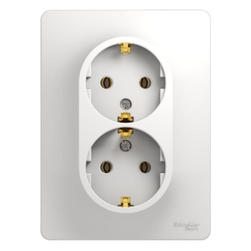Розетка двойная Schneider Electric Glossa (в сборе, цвет белый) с заземлением, без шторок подходит для сетей 250 В, на ток 16 А. - Заземляющий контакт обеспечивает дополнительную защиту от удара электрическим током. При наличии заземления электрический потенциал уходит в землю, защищая человека. - Выполнен из материала PС+ASA, стойкого к УФ-излучению и появлению царапин. - Двойная розетка позволяет подключить два устройства в одном месте.