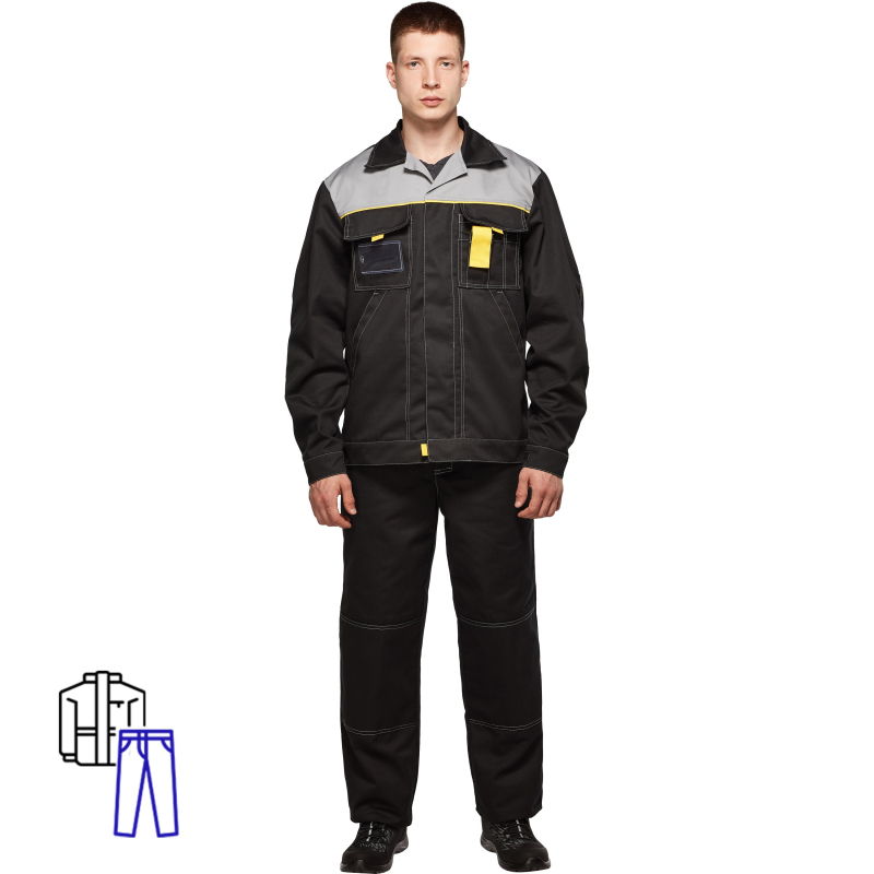 Костюм рабочий летний мужской л10-КБР состоит из куртки и брюк черного цвета с темно-серыми и желтыми вставками. Размер: 48-50. Рост: 170-176. Изготовлен из смесовой ткани с отделкой ВО (65% полиэстер, 35% хлопок), плотность ткани - 240 г/кв.м. За счет оптимального соотношения хлопка и полиэфирных волокон дают высокие эксплуатационные характеристики, не мнется, костюм держит свою первоначальную форму даже после многократных стирок, не требует глажки, износостойкий. Благодаря матовой поверхности ткани, одежда выглядит презентабельно и аккуратно. Куртка с застежкой на молнию и контактную ленту. Многофункциональные карманы, специальный карман для телефона, окошко для бейджика. На спине куртки складки для свободы движения. Рукава с усилительными налокотниками, защищающими от истирания. Ширина пояса куртки регулируется патой. Брюки с многофункциональными карманами. Костюм обеспечивает защиту от общих производственных загрязнений. Сферы использования: агропромышленный комплекс, жилищно-коммунальное хозяйство, организации торговли, бытовое обслуживание, гостиничный сервис, сервисные службы.